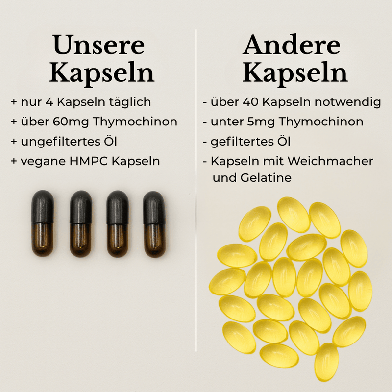 Schwarzkümmelöl-Kapseln sind ideal für alle, die den intensiven Geschmack des Öls nicht mögen oder eine einfache, geschmacksneutrale Einnahme bevorzugen. Sie sind besonders praktisch für unterwegs oder für Menschen mit empfindlichem Magen.