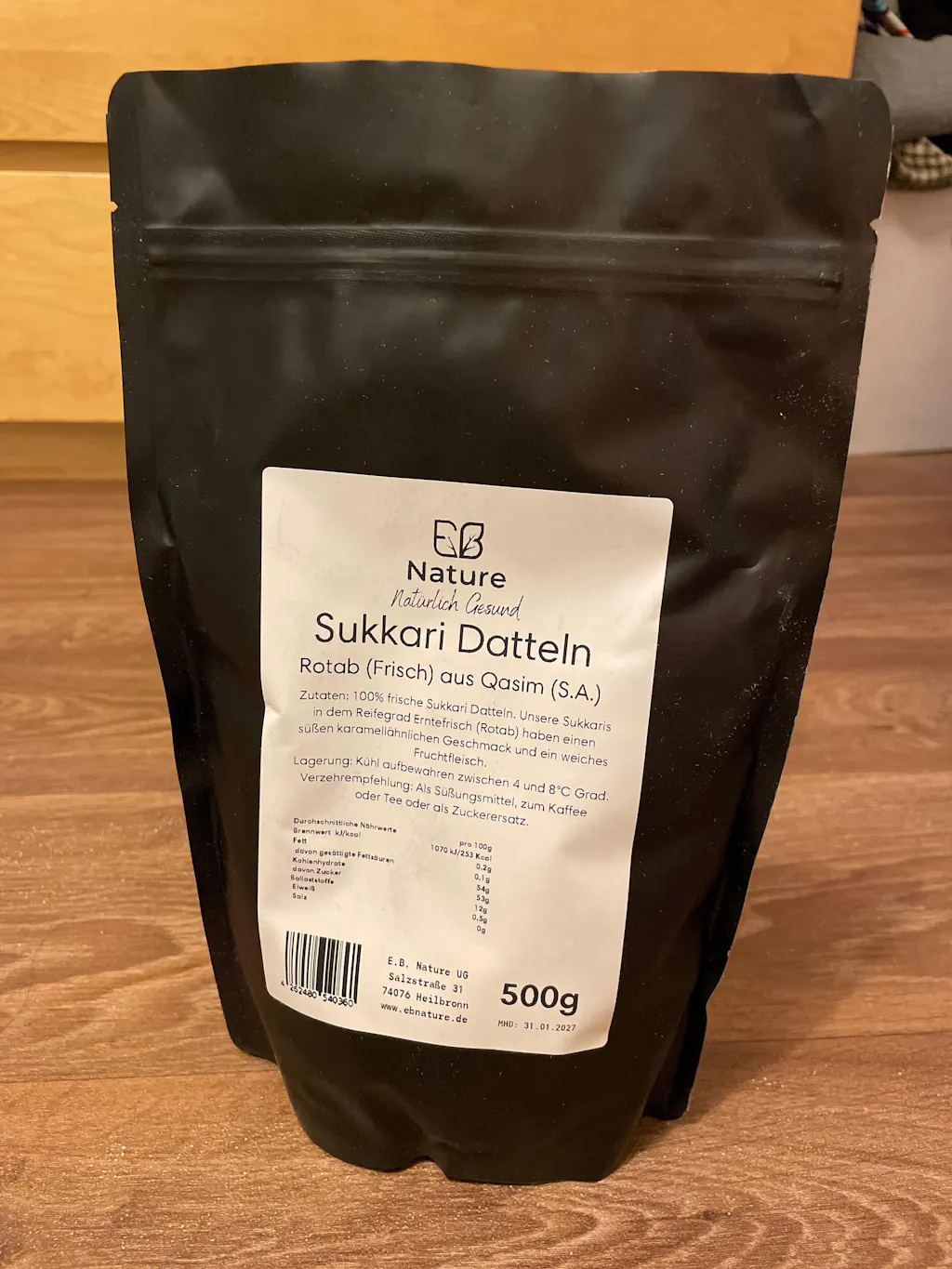 Diese Datteln sind super köstlich und eignen sich hervorragend um einzelne Speisen, Smoothies oder auch Fruchtaufstriche zu versüssen. Der Kern lässt sich super einfach entfernen. Durch den Zipbeutel, der übrigens sehr stylisch ist, werden sie hervorragend geschützt und eignen sich bestens für die Aufbewahrung im Kühlschrank. Mein Fazit: wer richtig süsse Datteln mag, hat in der Sukkari Dattel seinen Favoriten. Absolute Kaufenpfehlung und super qualitativ hochwertige Datteln .
